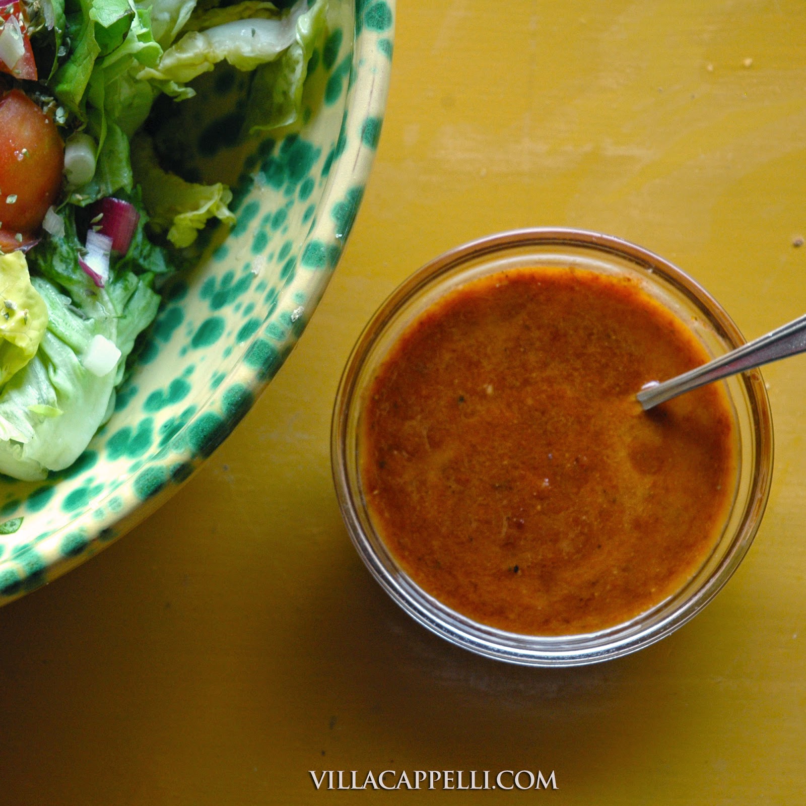 Sun-dried tomatoes are super healthy, and this recipe is a simple way to get a little more into your diet.  I originally made this to dress one of our fresh salads, but Paul couldn't resist trying it on some of the chicken cutlets we were having and it was delicious.